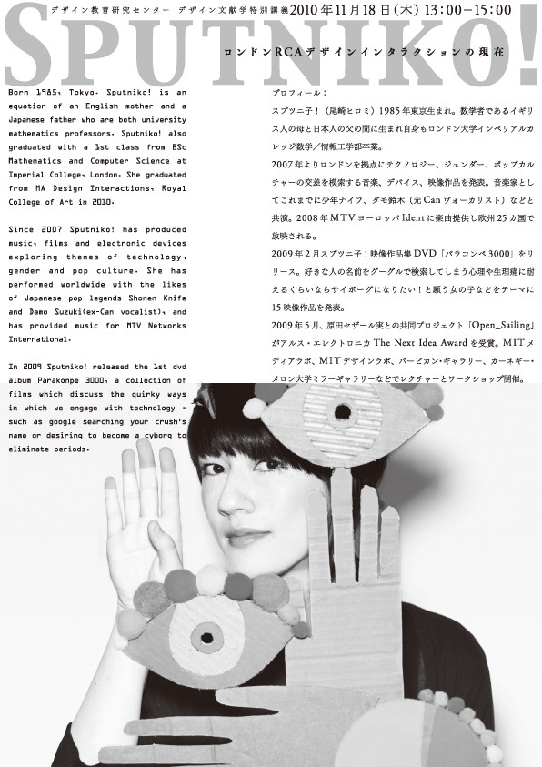 その講義にて、11月18日(木)にSputniko!氏をお招きして、「ロンドンRCAデザインインタラクションの現在」という講義タイトルにおいて特別講義を開催します。聴講無料、申込不要ですので、お時間のある方はぜひ参加してみて下さい。