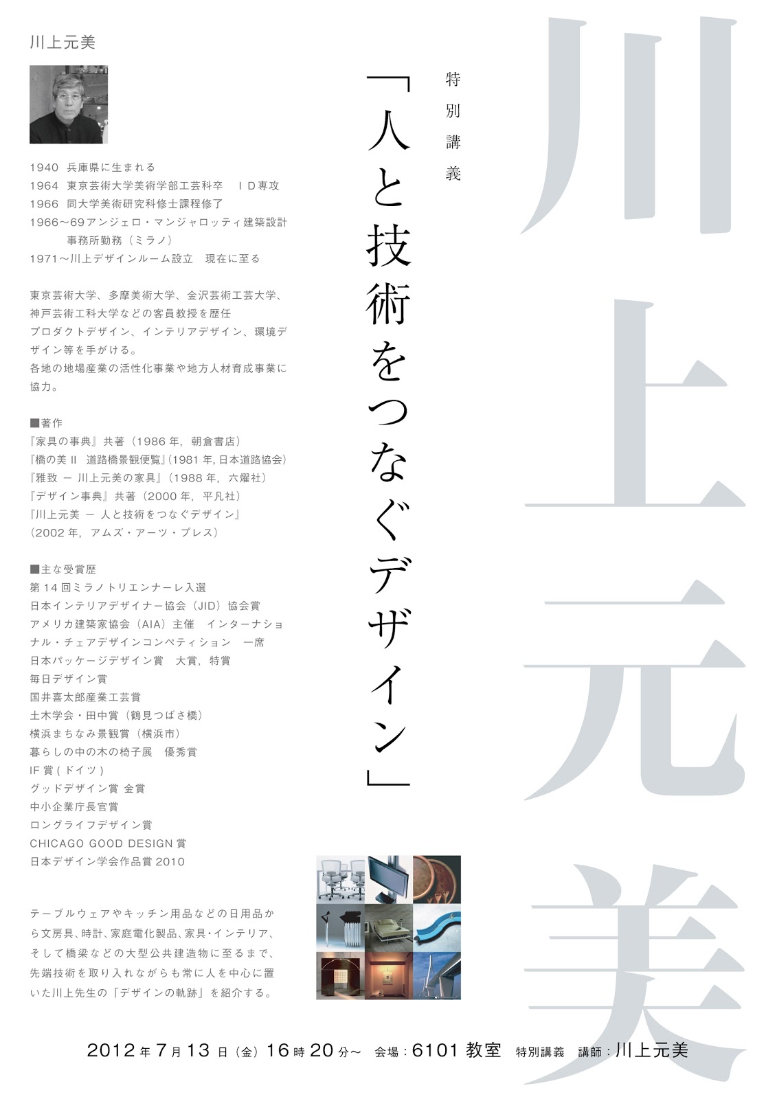 2012年7月13日(金)16:20より、客員教授 川上元美氏による特別講義「人と技術をつなぐデザイン」を開講いたします。