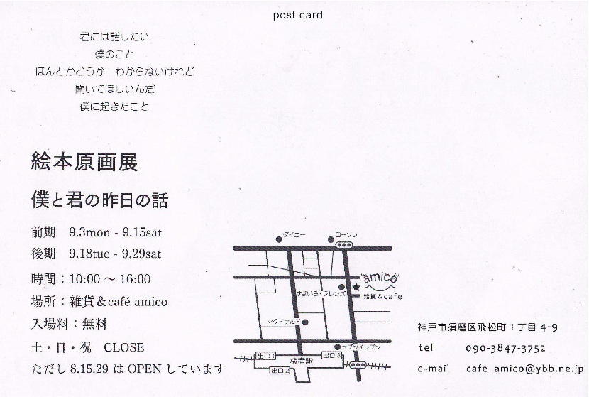 NPO法人すまみらいが、統合失調症という病気について知ってもらうことを目的として制作した「僕と君の昨日の話」という絵本の原画展が、雑貨&カフェ「amico」で行われます。