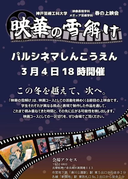 今年も映像表現学科(現:メディア芸術学科)映画コースの学生たちによる、春の上映会「映華の雪解け」を開催する運びとなりました。この上映会は、映画コースとしての活動を締めくくる節目となる上映会です。映画コースの学生がこれまで […]