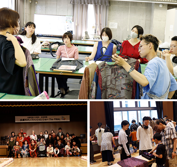 兵庫区役所2階みなとがわホールにて、ファッションデザイン学科(現:ファッション・テキスタイルコース)が企画・運営に携わった「兵庫モダンシニアファッションショー」を開催しました。コロナ禍を経て3年ぶり、そして最終回となった本イベントでは、シニアファッションの第一人者・見寺貞子名誉教授を中心に、学生がショー運営や着物リメイクの指導を担当。ワークショップに参加した親子や本学学生もモデルとして出演しました。年齢や立場を越えて一人ひとりが主役となり、会場は温かな活気に包まれました。
