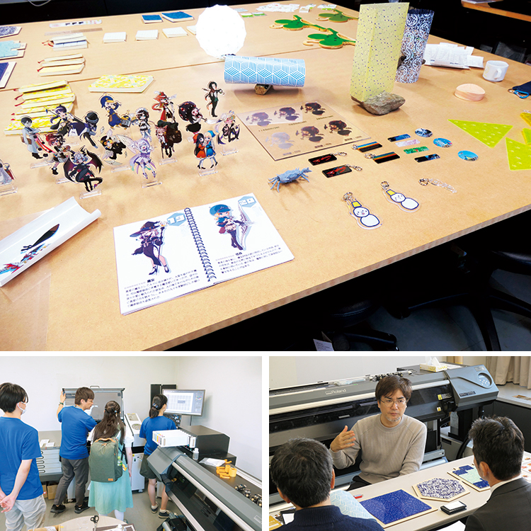 ローランド ディー.ジー.株式会社と連携し、同社のUVプリンタ(樹脂インクを紫外線で硬化させて印刷するプリンタ)を用いてデザイン事例開発に取り組みました。立体的な印刷や透明インクも使えるUVプリンタならではのさまざまなデザインや作品が実現しています。