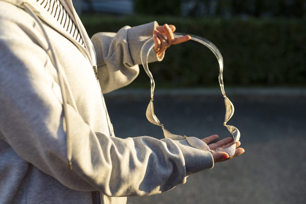 これも自主制作なのですが、2年生のときにつくった「光」というネックレスです。私が初めて「コンテンポラリージュエリーをつくるぞ!」という気持ちで制作したものです。波状に形成したシルバーのパーツをつなげて、透明感のあるアクリル素材と合わせました。シルバーパーツの上部が光を反射して身体に反射光が映るようになっています。パーツの下部は光の粒子をイメージして、一粒ずつ細かく打っていきました。