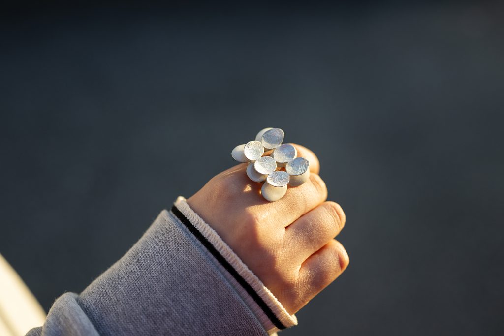 「光をまとうジュエリー」を意識しました。「誰もがそれぞれ違う輝きを持っているので、他人と比べることなく、ひとりひとりの個性を大事にしていれば、ただ生きているだけで美しく輝いているのだ」ということを表現しています。「内面の輝き」という意味で、身に着けると見えないところですが、シルバーパーツの内側にも金箔を貼りました。私が貴金属を好きな理由のひとつが、この輝きなんです。時間が経っても変わらず輝き続ける。指紋の話と同じで、不変性に惹かれるのです。