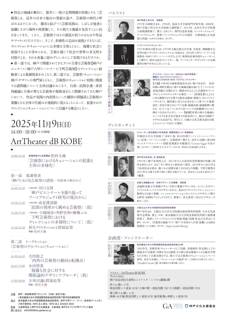 11月9日(日)14時より、神戸市長田区のArtTheater dB KOBEにて、開催される「神戸・芸術祭シンポジウム ―キュレーションの構造と変容」に本学芸術工学教育センターの谷口文保准教授が登壇いたします。