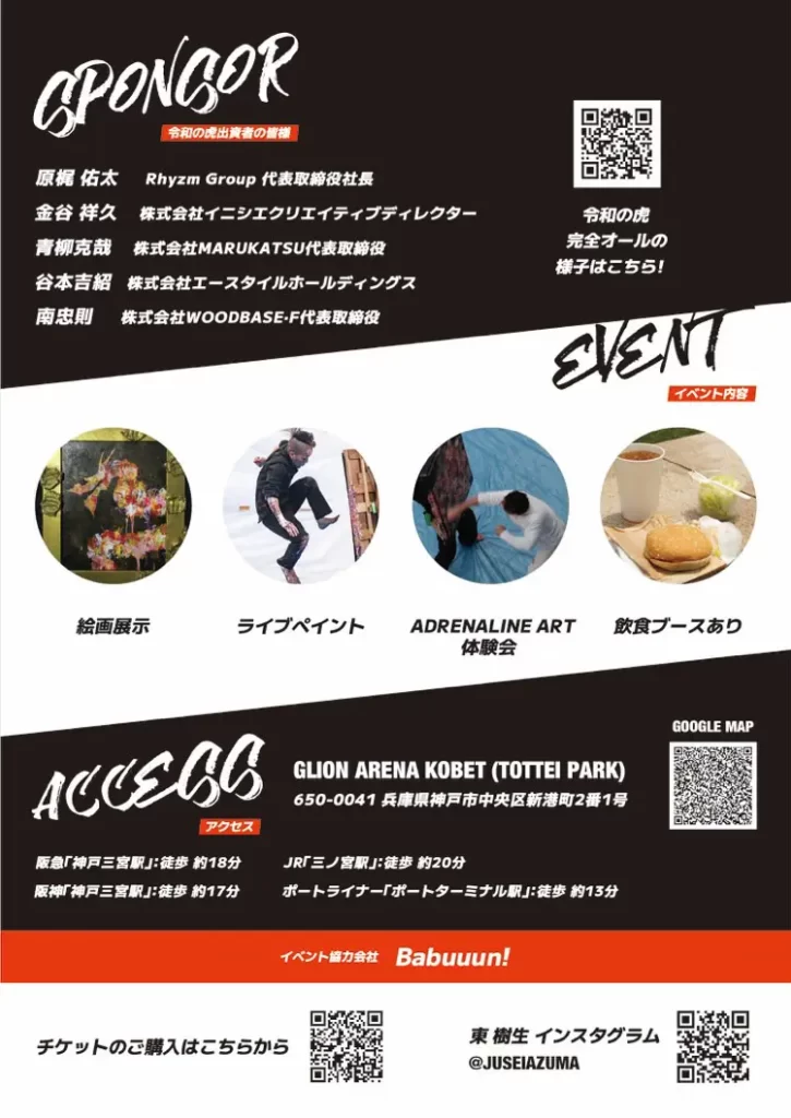 身体に絵具を塗り、拳・頭突き・蹴りを全力でキャンバスに叩きつける、唯一無二の表現手法「ADRENALINE ART」を用いて作品を制作しているアーティスト。