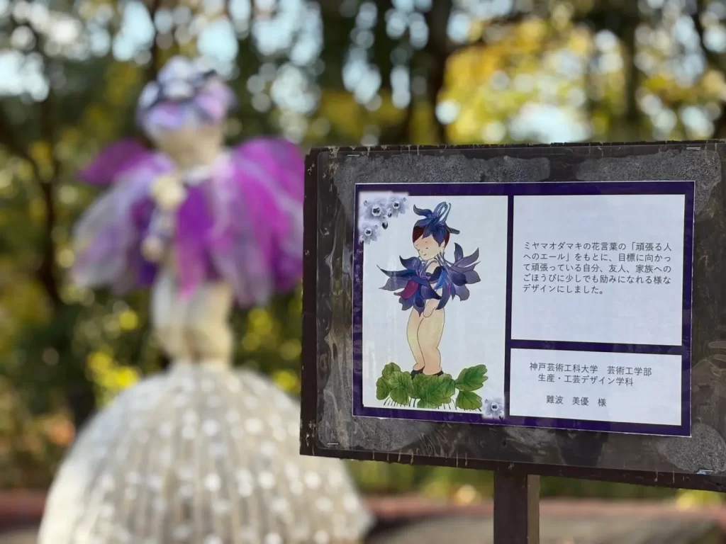 今年のテーマは「ミヤマオダマキ」。学生たちは花言葉・色彩・属名・分布などから着想を得てデザインを制作し、全16作品の中から来園者投票により、生産・工芸デザイン学科2年生の難波美優さんのマントデザインが選出されました。