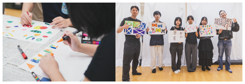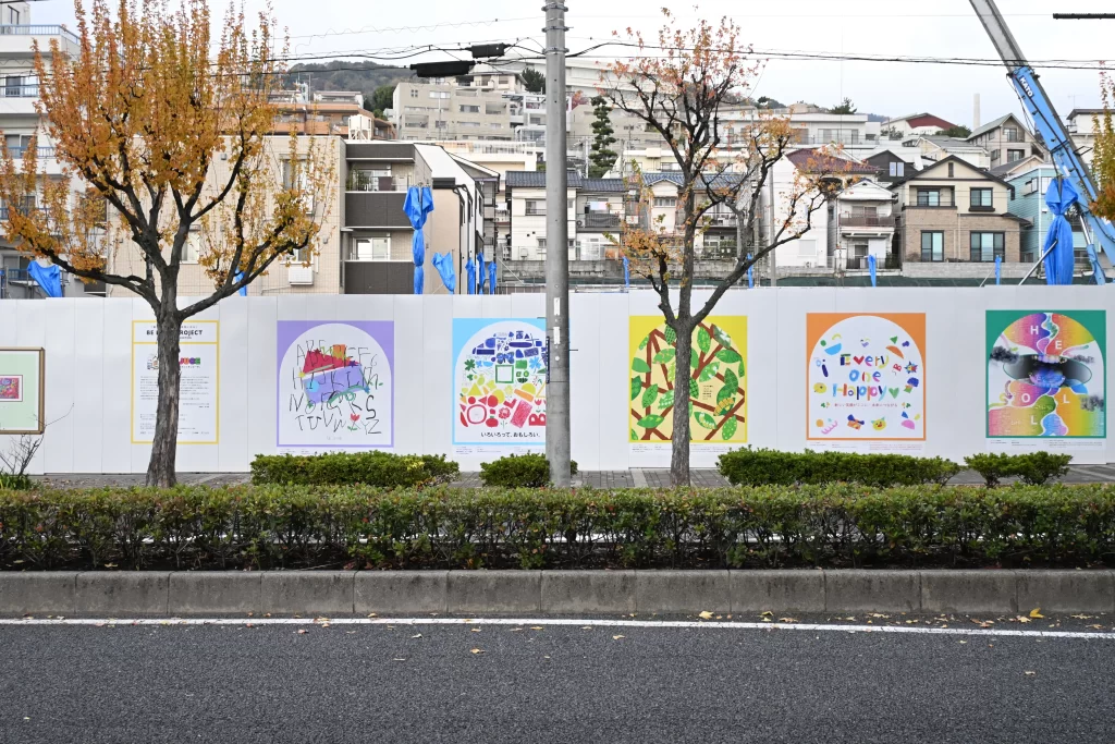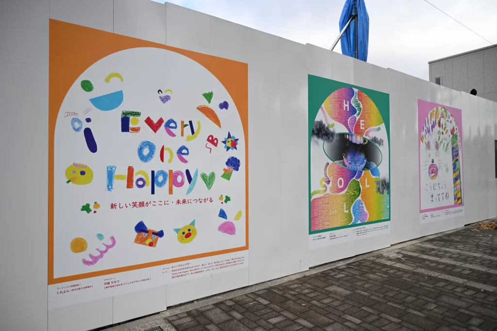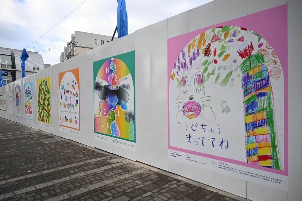 ワークショップでは5つの福祉事業所から計18名のアーティストが参加し、200点を超える作品が生まれました。本学学生はそれらをもとに、ミックスジュースの「いろいろな味がひとつになる」イメージを象徴とした12点のバナー作品を制作。工事現場の仮囲い全体をアート空間として再生し、地域に向けて“多様性が豊かさを生む社会”というメッセージを発信しています。
