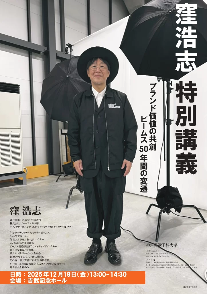 2025年12/19(金)神戸芸術工科大学にて、株式会社ビームス取締役であり、神戸芸術工科大学の客員教授でもある窪浩志氏による特別講義を開催いたします。