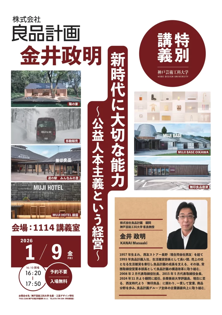 2026年1/9(金)神戸芸術工科大学にて、株式会社良品計画 顧問であり、神戸芸術工科大学の客員教授でもある金井政明先生による特別講義を開催いたします。