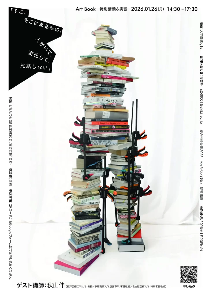 ──今回の講義・実習では、これらの問いを手がかりに、グラフィック・デザイナーであり、edition.nord 主宰の秋山伸氏を迎え、アートブックをめぐる実践と理論を多角的に検討していきます。作品、空間、読者のあいだに生まれる関係性を軸に、造本や編集の視点から新たな読みを探る場となります。