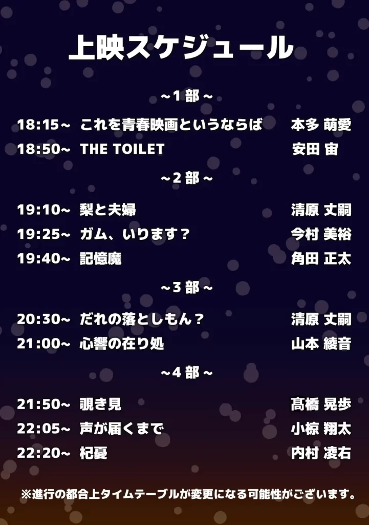 この上映会は、映画コースとしての活動を締めくくる節目となる上映会です。映画コースの学生がこれまで積み重ねてきた時間と、その先に広がる可能性を映し出します。