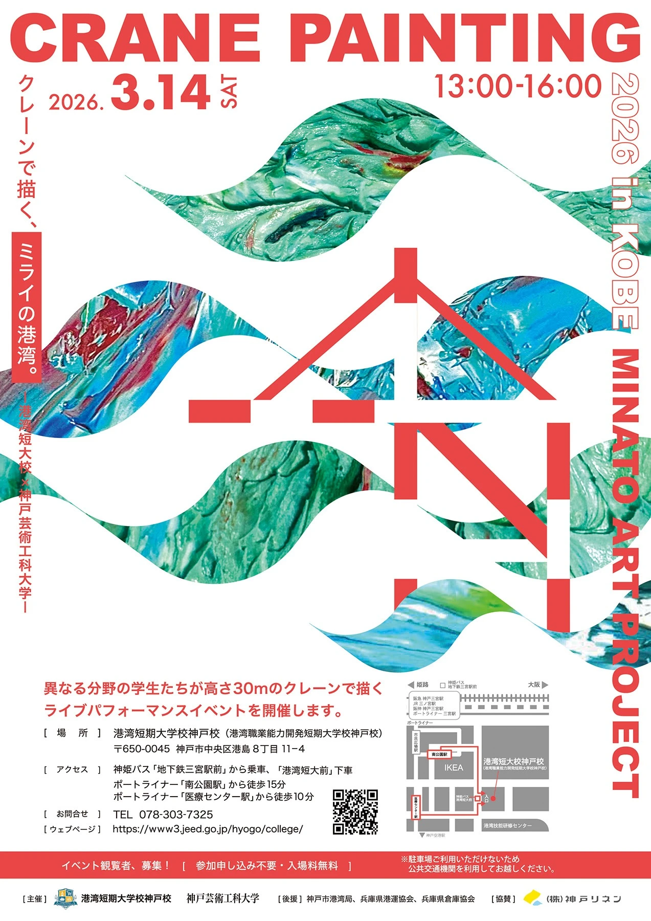 港湾職業能力開発短期大学校神戸校と神戸芸術工科大学は、神戸市および関係機関と連携し、地域共創プロジェクト「みなとアートプロジェクト」を立ち上げます。その第一弾として、2026年3月14日(土)、高さ約30mのクレーンを用いた学生によるライブペイントイベント「クレーン・ペインティング 2026 in KOBE ― クレーンで描くみらいの港湾 ―」を開催いたします。本イベントでは、港湾エリアを象徴する大型クレーンを舞台に、両校の学生が共同で作品制作を行います。普段は産業インフラとして稼働するクレーンを、“表現の絵筆”へと転換することで、産業と芸術が交差する神戸港ならではの風景を創出します。