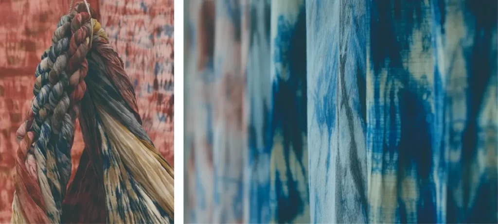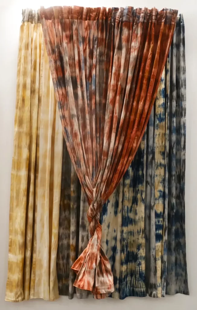 本作は、日本の伝統的な染色技法を取り入れ「境界」の可能性を探る作品です。注連縄状に布を絞り、弁柄・藍・柿渋・お茶・松煙の技法を重ねて染め、解く行為により境界が溶け、新たな調和が生まれる様を表現しました。異なる技法を組み合わせることで伝統に新たな価値を生み、それが継承に繋がるアプローチになることを目指しています。