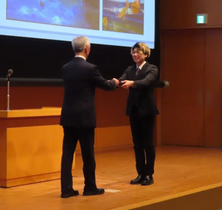 正賞を受賞した、ビジュアルデザイン学科4年生の藤島海さんは、共同制作者の牧瞬さんとの活動を振り返りながら「今後も心を動かすデザインを生み出していきたい」と力強い抱負を述べました。式典は和やかな雰囲気の中、それぞれの活躍がたたえられた機会となりました。